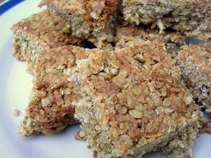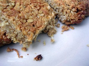 Melt the butter, stir in the sugar, golden syrup and baking soda. Carefully fold everything else in, spread into a good-sized tin, well greased, and bake for 15 mins at 180 C. Cool, and cut into squares. It may look a little soft and puffy coming out of the oven but this is fine. Consider this recipe a mere blueprint though, as it can really take anything you throw at it. I added bran and kibbled rye to mine, but you could add all manner of goodies – chopped dried fruit, sultanas, chocolate chips, quinoa flakes, linseeds ground or whole, pumpkin seeds, etc. If I am going to be adding more things to it I tend to up the butter slightly just to give it more “glue” to hold together.