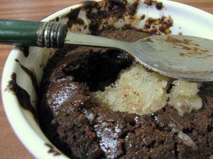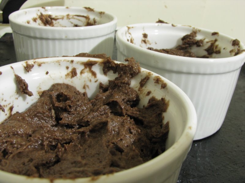 And of course, when the weather is cold I crave some kind of pudding. Also when the weather is fine. Either way, we haven’t had a proper pudding in a while and after dinner on Thursday I didn’t quiiiite feel ready to finish eating for the night. I played with the Chocolate Pear Pudding from Nigella Express, I’ve made it before but it’s quite adaptable. Here it takes the form of Chocolate Banana Surprise Pudding, (the surprise being the unexpected square of chocolate that is nestled within the batter!) It is beyond simple to whip up. What I did was cream 150g soft butter with 125g brown sugar. I added an egg, 1 overripe banana, 125g flour, 25g cocoa and 1 t baking powder. You may need to add a little milk if the mixture is too stiff. This went into three 250ml ramekins – although I’m sure you could play with proportions – and I pushed a couple of squares of dark chocolate under the batter of each. These were baked for 25 minutes at 200 C. The tops are cakey and delicious while a spoon, plunged into the heart of the pudding reveals stickily saucy chocolately depths. Perfect with a spoonful of Banana, Pear and Dark Chocolate Sorbet melting into it…