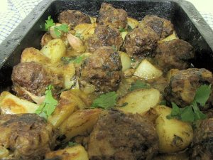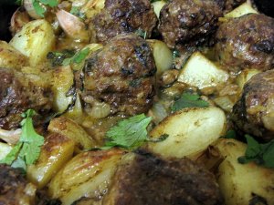 Heat oven to 190 C. Heat a little olive oil in a frying pan, then add the onion and spices, stirring till the onions are soft and becoming fragrant. Add the spinach, cooking briefly till it wilts. Tip all this into a bowl with the mince, egg, and coriander. Squeeze it all together with your hands, roll the mixture into meatballs, and toss them in the flour. Using the same pan that you fried the onions in, brown the meatballs in batches, transferring them to a shallow oven dish as you go. In that same pan, cook the potatoes gently for about ten minutes, stirring occasionally. Add a spoonful of flour and let it absorb all the residual pan juices, then add the tomato puree and stock, bringing to a robust simmer. Carefully pour this over the meatballs, cover with foil (I admit I forgot to though) and cook for at least half an hour.