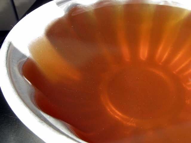 I funked it up a little by adding an apple-friendly chamomile teabag to the boiling water for a spell, and strewing some finely-chopped mint through the mixture once it was nearly set. But first: dissolve the apple tea in the boiling water. While that’s happening, soak the gelatine leaves in a large lasagne-style dish filled with cold water for about a minute. They will soften slightly, and then, one at a time, pick them out of the water, squeeze them – which is rather squelchily pleasurable – and stir into the boiling apple tea, whereupon they will dissolve instantly. Pour the gelatined apple tea into your chosen receptacle, and then refrigerate for 8 hours or overnight.
