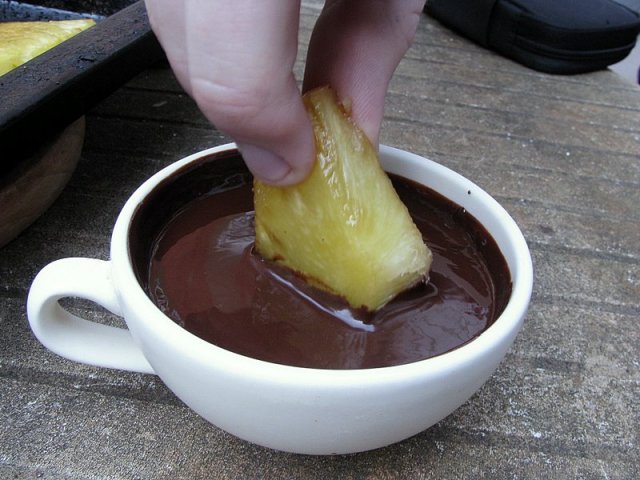 Saturday’s weather was beyond awful – gale force winds and pelting rain. Sunday, however, in typical Wellington fashion, was the complete opposite – an unutterably beautiful day. I purchased a pineapple at the vege market for a dollar and imagined I would sprinkle it with chopped mint and fresh ginger and serve it for a sparklingly healthy dinner. Then Tim said “or we could dip it in chocolate?” Brilliant. I was sold.