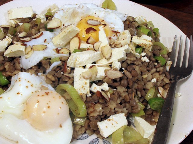 To wit: I had it in my head that lentils topped with a poached egg might be cool. This developed further when I thought about padding it out with what else was in my kitchen – butter-fried leeks, a sprinkling of almonds and feta… Then I completely second-guessed myself. Is lentils and egg together both freaky and depressing? At best? Leeks – are they still hip? Would the whole thing be too earthy and aggressively sulphuric? Would the brown, yellow and green shades call to mind a polyester blouse from the 70s instead of effortless culinary elegance?