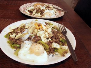 I think lentils and eggs and feta sounds brilliant. Sort of like fuls medames.