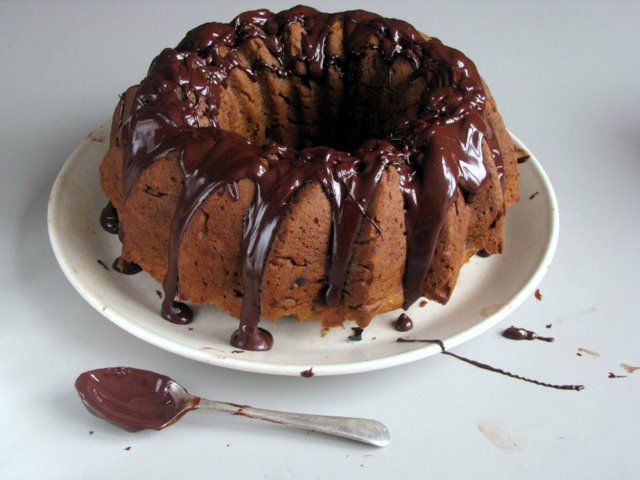 I adapted the recipe slightly. I added some cinnamon. I didn’t have any white chocolate in the house so dark chocolate was drizzled over instead. Now, I love me some white chocolate – I’d spread it daily on hot buttered toast. But I do think that the dark chocolate I substituted contrasted so awesomely with the sweet earthiness of the cake and its spices that it would be hard to use anything else. It’s a complete breeze to make and happily requires a bundt cake tin, thus justifying me actually owning one.
