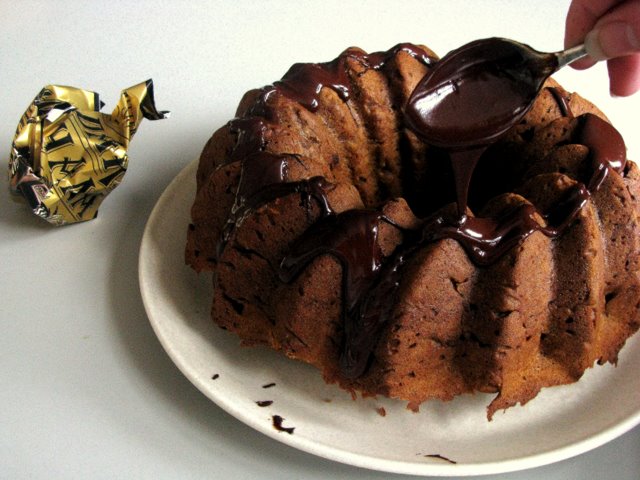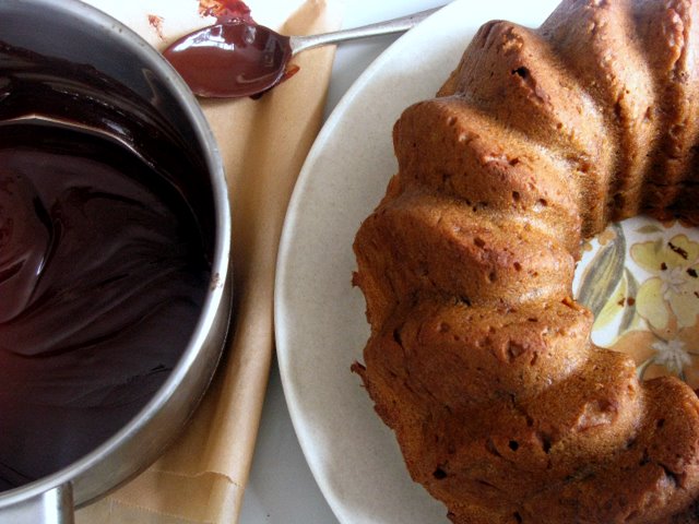 I adapted the recipe slightly. I added some cinnamon. I didn’t have any white chocolate in the house so dark chocolate was drizzled over instead. Now, I love me some white chocolate – I’d spread it daily on hot buttered toast. But I do think that the dark chocolate I substituted contrasted so awesomely with the sweet earthiness of the cake and its spices that it would be hard to use anything else. It’s a complete breeze to make and happily requires a bundt cake tin, thus justifying me actually owning one.