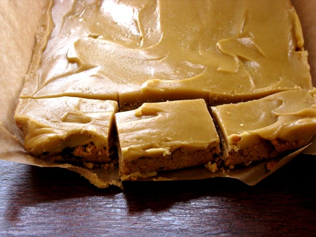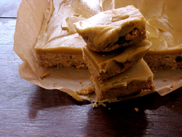 This is one of the simplest and loveliest icings you can make. While the base is baking, gently melt together the butter, golden syrup and ginger in a small pan over a low heat. Once it comes together in a golden spicy puddle, remove from heat and stir in the icing sugar. As soon as the base is cooked, pour the icing over it, still warm and smooth out if necessary. Refrigerate for 1/2 an hour or so before slicing into fingers.