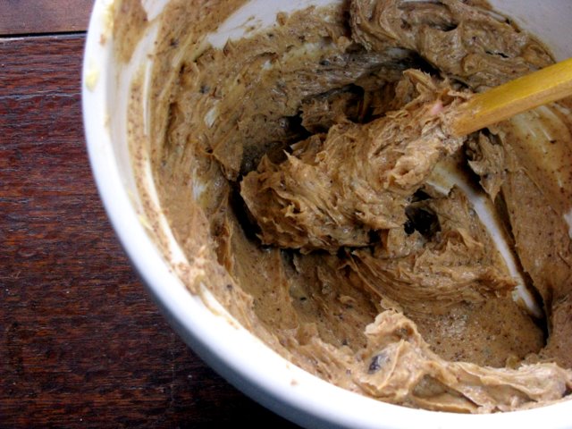 Using a wooden spoon or spatula or some other kind of utensil that takes your fancy, beat the butter and sugar together till light and creamy. Muscovado sugar is a little dense and crumbly so fear not if some of the sugar remains in lumps. As I said, brown sugar is fine too, and is what I generally use if I see muscovado sugar asked for in a recipe. But muscovado was cheap at the local supermarket…