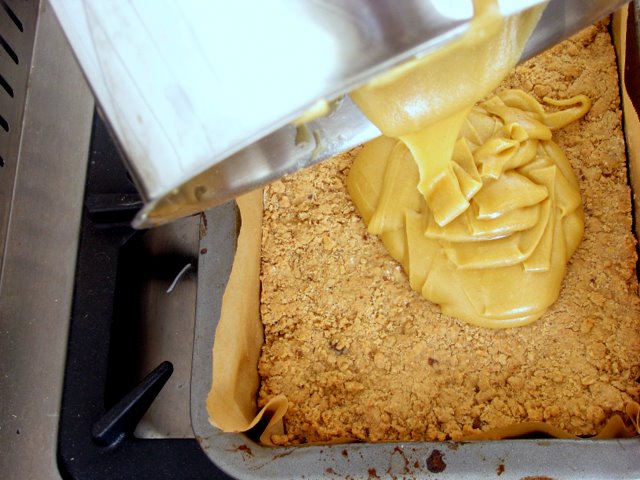 Tip in the toasted oats (putting a sheet of baking paper into the now-empty brownie tin), bran, flour, ginger and baking powder. Stir together carefully till it looks like biscuit dough, soft and clumpy. Tip this mixture into the brownie tray, pressing down with the back of a spoon. Bake for 15-20 minutes till nicely golden on top.
