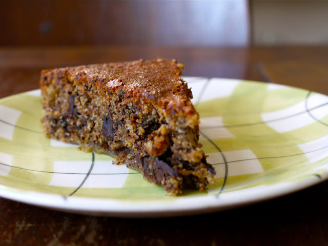 I love how no-nonsense the method is – no separating of eggs, no whisking till your arms ache, just a bit of chopping and mixing but you end up with this incredibly good-looking cake as a result. It’s solid but light and amazingly buttery. Some of the chocolate melts into the cake as it cooks and the rest remain whole, as darkly rich chunks that contrast with the soft grittiness of the almonds. It’s amazing, and a bit like a really, really sophisticated chocolate chip cookie. And it’s gluten free for those of you who swing that way.