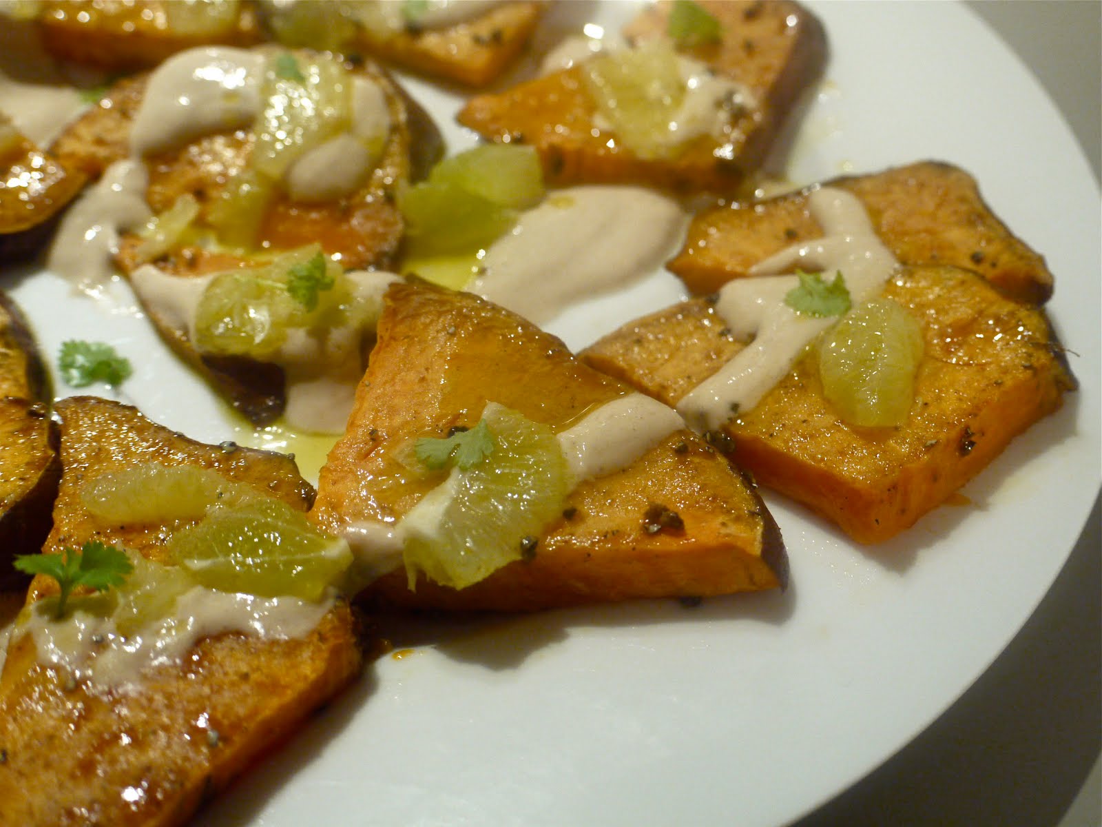 Roasted Kumara with Lime, Yoghurt Tahini Sauce and Chilli