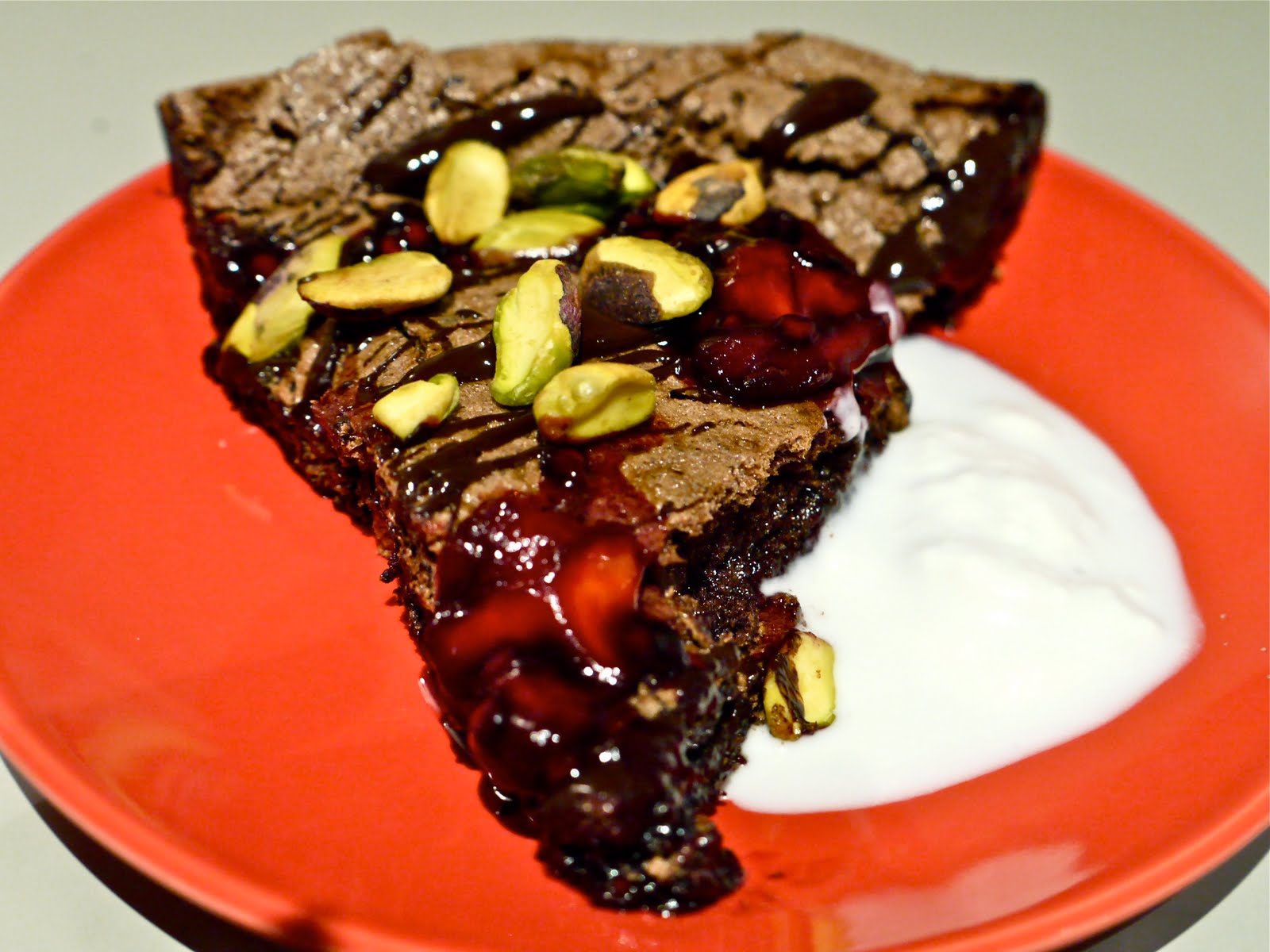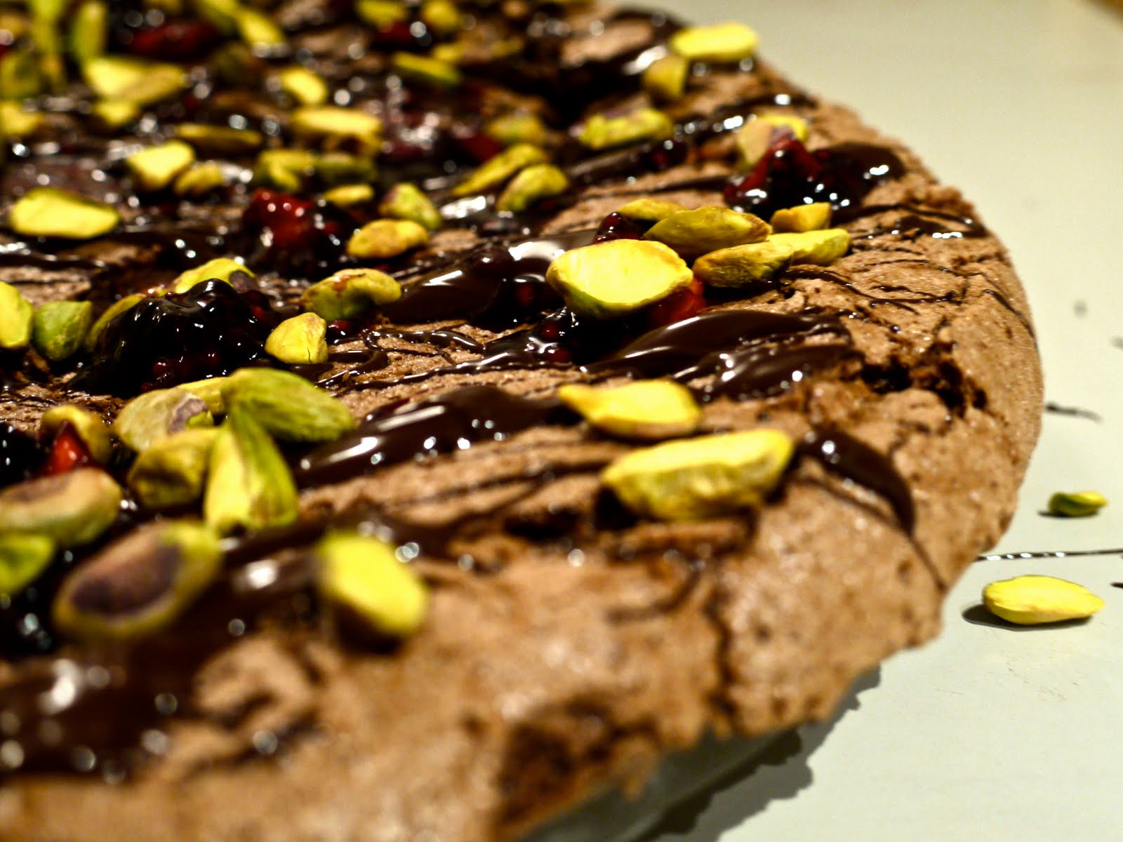 While the pav is baking, scoop out the seeds and flesh of the tamarillo, tip into a small bowl and sprinkle over the brown sugar, allowing it to dissolve. Swipe a sharp knife through the flesh if the seeds aren’t loose enough – you want a loose, chunky mixture as opposed to large, separate pieces. I hope that makes sense. Melt the dark chocolate and drizzle spoonfuls generously, Jackson Pollock-styles across the pav. You don’t have to use the whole lot, but don’t let me hold you back. Spoon the tamarillo seeds, flesh and juice evenly over the top and finally sprinkle thickly with pistachios. Serve in wedges with a spoonful of coconut cream on the side.