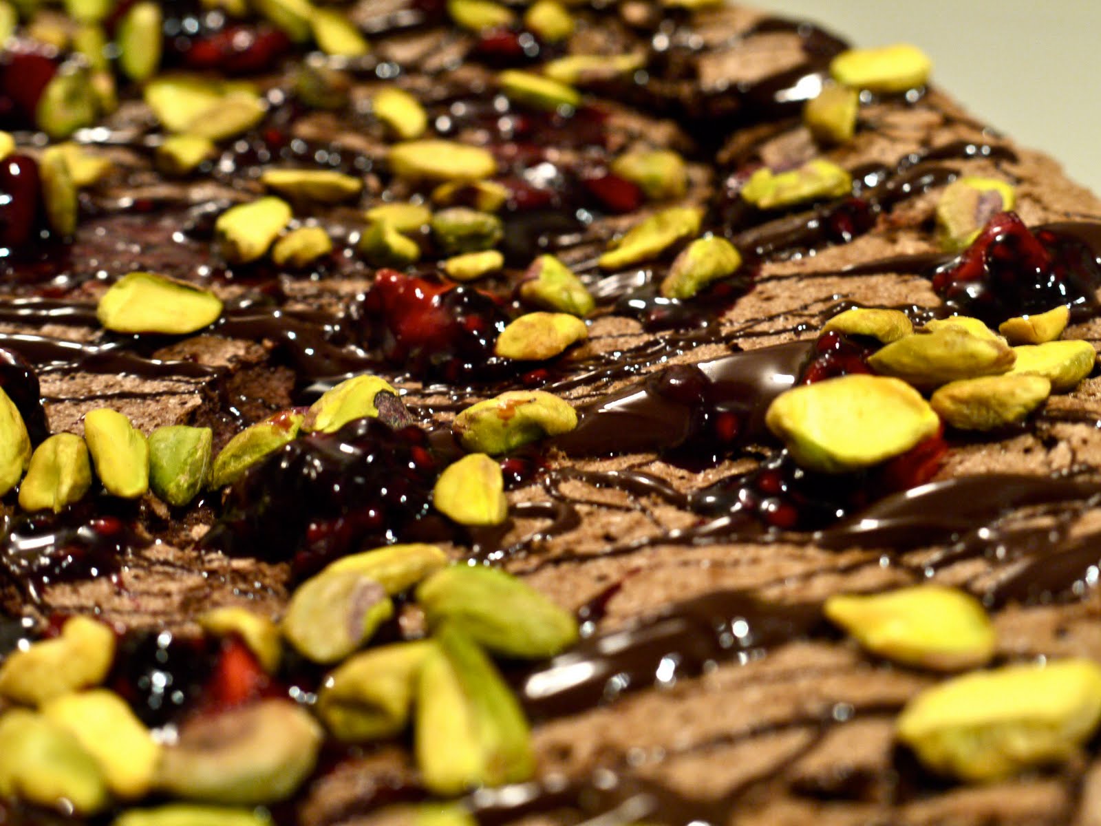 Chocolate, Tamarillo and Pistachio Pavlova with Coconut Cream