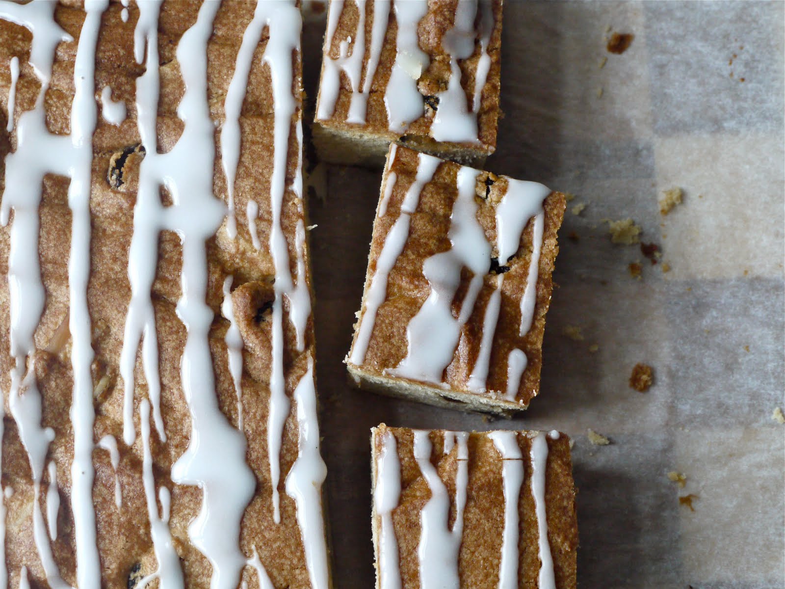 Set your oven to 180 C/370 F, and line a baking tin – not too big, not too small – with baking paper. Cream butter and sugar, then add the vanilla. Beat in the egg, then alternatively mix in the milk with the dry ingredients. Stir in the Brazil nuts and fruit. Bake for 40 minutes, then ice with lemon icing when cool and cut into squares. I mixed up some lemon juice with icing sugar till it was a thick enough to drizzle off a spoon onto the cake, but feel free to smear it with lemon butter icing as the recipe suggests.