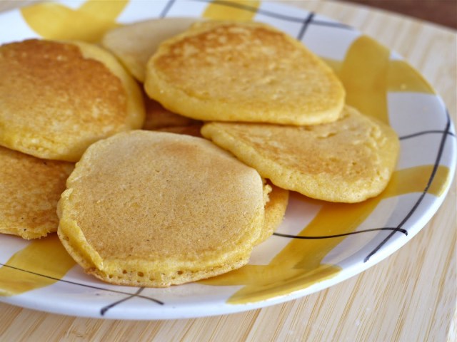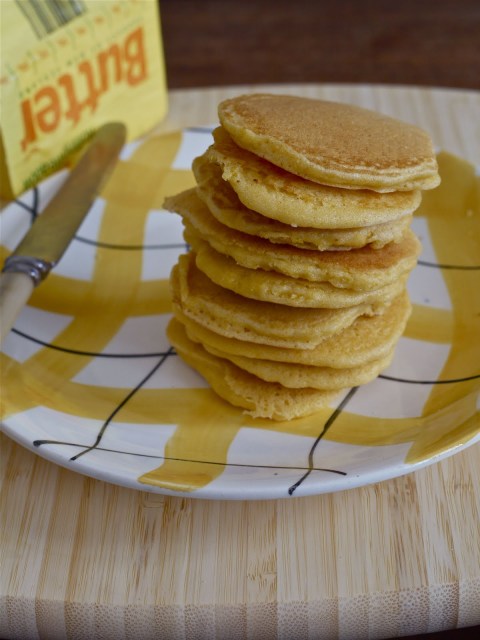 Stir together the dry ingredients in a bowl, then whisk in everything else till you have a thick, yellow batter (don’t worry about any small lumps.) Heat an oiled griddle or pan and drop tablespoons-ful into it. Once they’re thoroughly bubbled on top, carefully turn them over to cook on the other side. Transfer to a plate and cover with tinfoil till you’re finished.