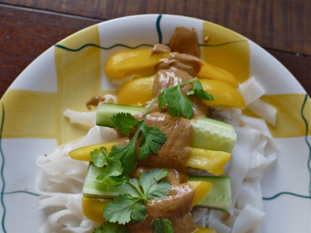I’m not sure if it’s a mid-eighties thing or what, but H&H specified melons (oh my!) in the salad and much as I’m fairly adventurous, I wasn’t quite ready for it covered in peanut sauce…I figured the easier-found cucumber was within the same gene pool and along with some capsicum, would provide colour and juicy crunch. As I switched the required egg noodles for a lighter-textured pile of slippery, soft rice noodles, there’s nothing stopping you swapping the chicken for slices of fresh, firm tofu. And the more I think about it, the more it feels like peanut sauce on melons would have worked just fine…if you try it yourself, let me know!
