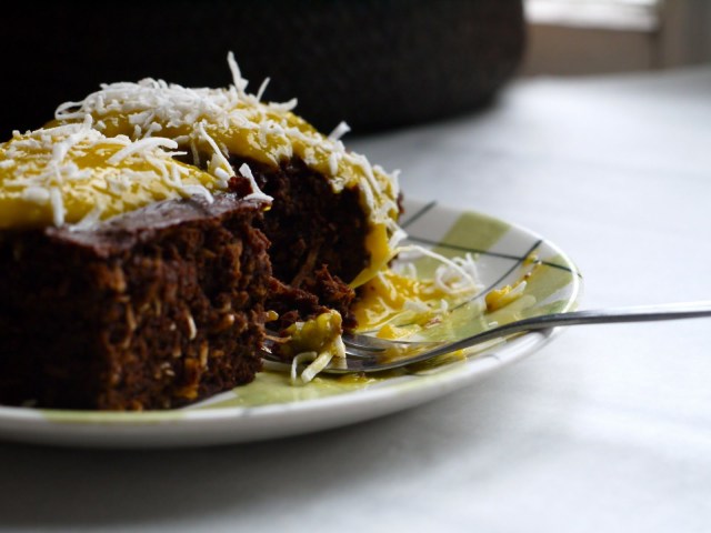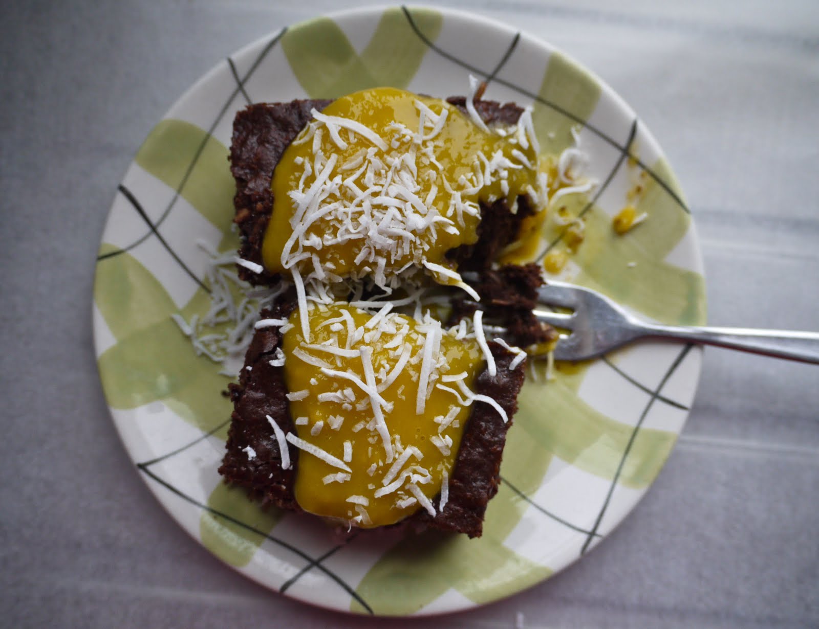 So what do they taste like? Separately, both recipes shine – the slippery, fragrant, island-paradise taste of mangoes, elusive and slightly peachy and barely tampered with in this sauce. The condensed milk gives the brownies a melting texture punctuated by the strands of coconut, like fibres in a coir mat (Wait! No! That doesn’t sound nice at all!) and the combination of dark chocolate and cocoa gives a broad spectrum of chocolate flavour. Together though, far out they’re good – the cool, fruity sauce cutting through the sweet, throat-filling brownie, the fragrant mango and coconut cosying up together in an extremely delicious manner.