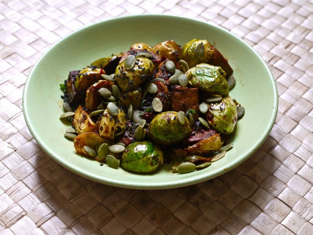 Yay, simultane-blog! I'm totally excited about this recipe and how it's taken such a simple formula (brussels sprouts + nut/seed + protein) and turned it over on its head. Or something like that. Must try it soon.