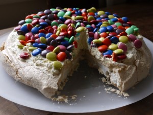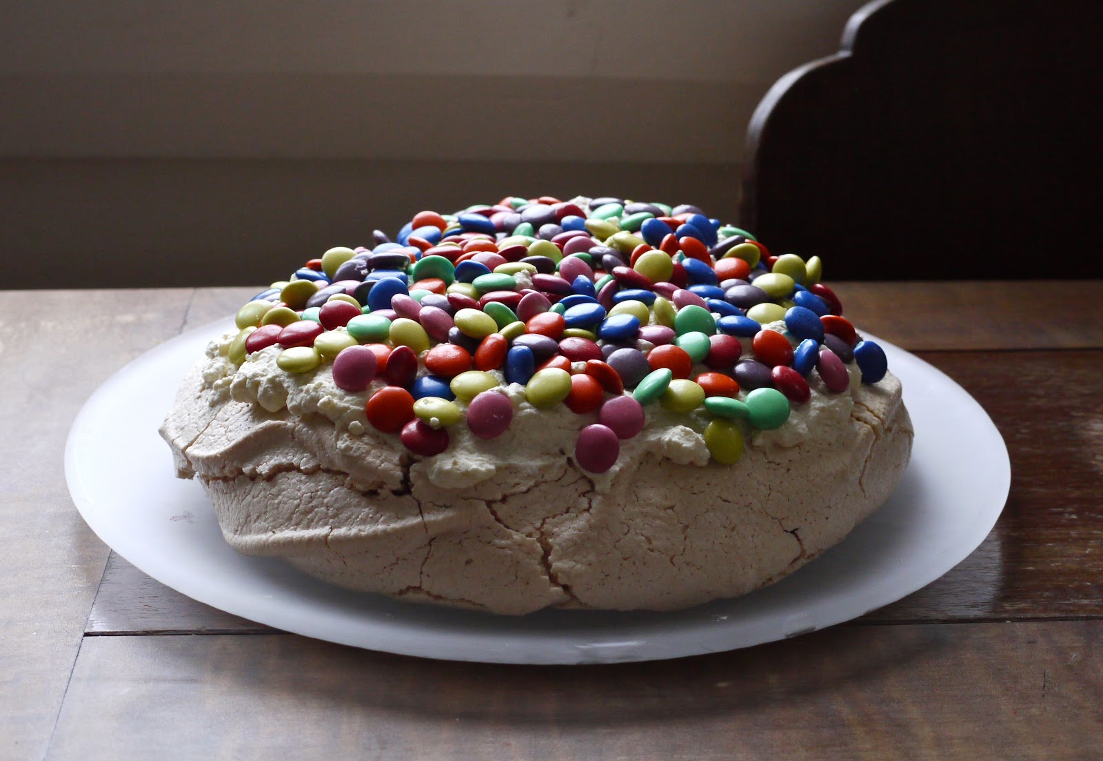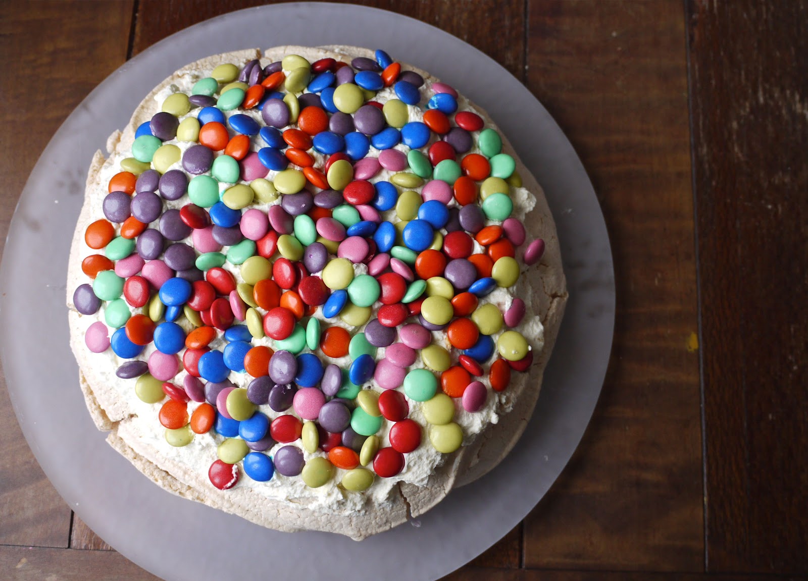 Whisk the cream and brown sugar until stiff and spreadable, but not so stiff that it’s getting granular and threatening to turn into butter. Spread it thickly across the top of your cooled pav, and then carefully topple over the smarties. Half of them will probably fall off, but just scoop them up and use them to fill in the gaps. Admire.