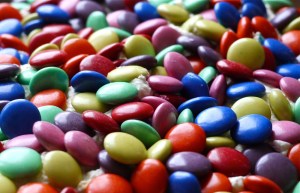 Between 300g and 500g smarties/m’n’ms/pebbles/equivalent. I picked out all the brown and white ones and ate them because I wanted bright colours only.
