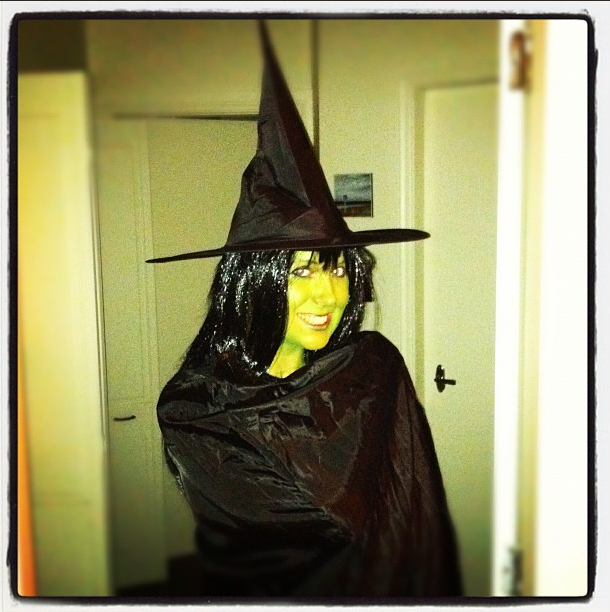 A few days after the last remaining slice of that pavlova disappeared, I met with the same group of friends at the same house, for a Halloween party. Neither Tim nor I had ever been to one before so we went all out, like Cady Heron in Mean Girls. None of this “I’m a mouse, duh!” here. I fulfilled a long-held desire to dress up as Elphaba/Wicked Witch of the West from Wicked (didn’t have time or a willing photographer to let me recreate every promotional photo since 2003, but maybe next Halloween) and it was so fun. That’s green eyeshadow all over my face, not facepaint – a little advice from me to you – and the hottest, itchiest, prone-to-moultingest $2 shop wig ever.