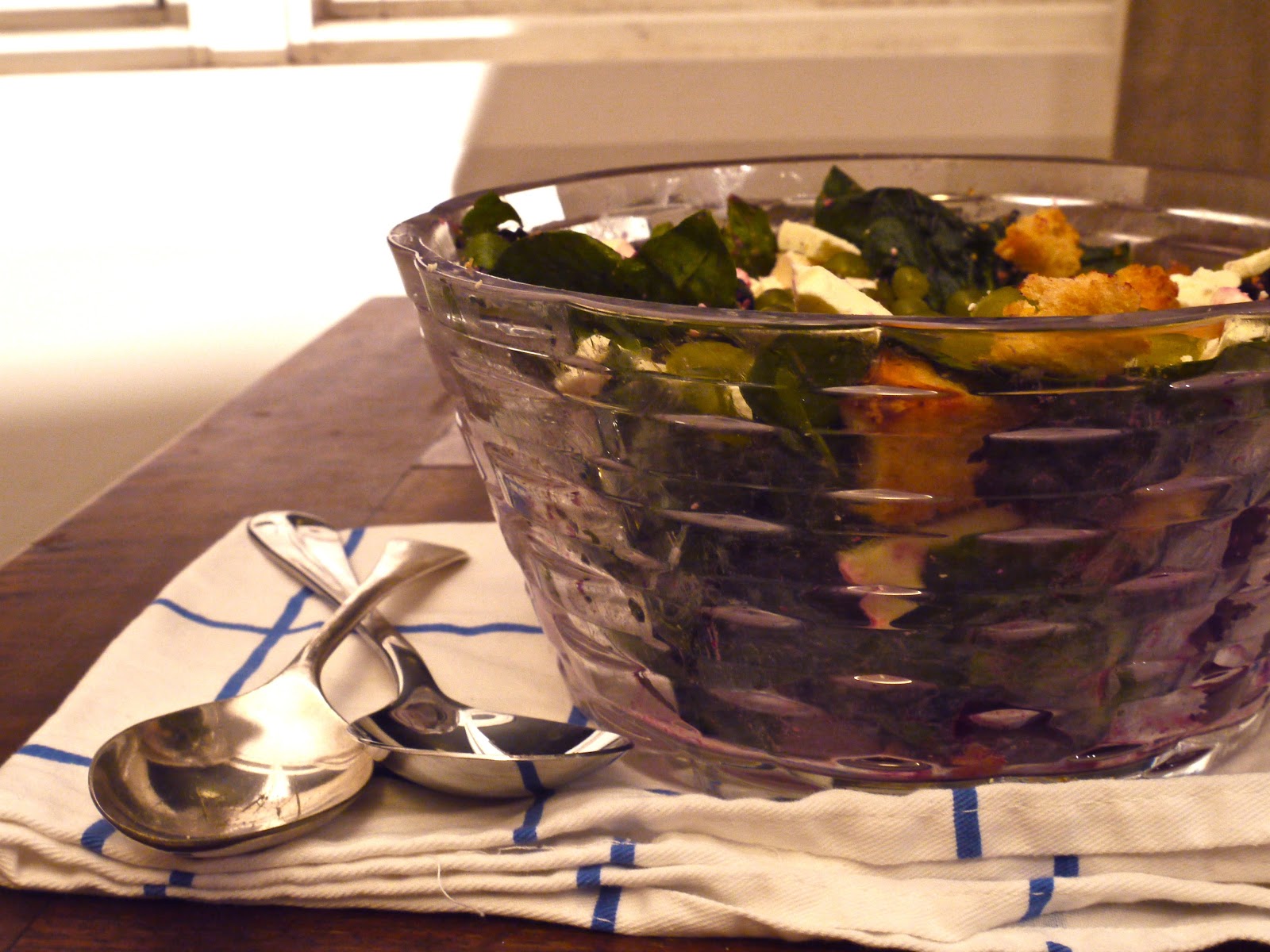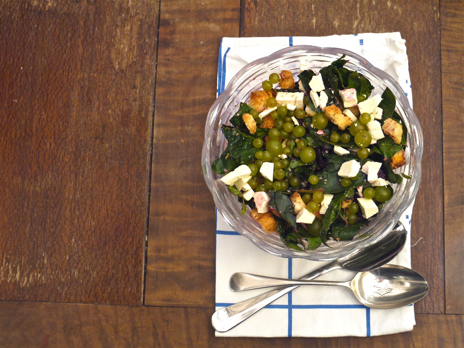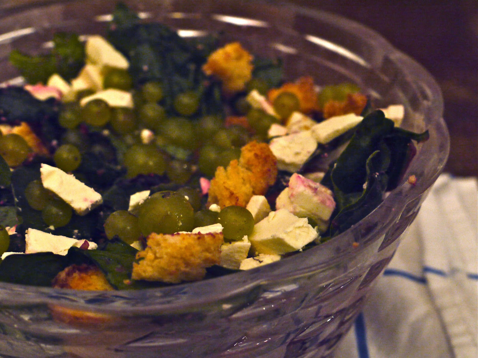 Roast Beetroot and Spinach Salad with Croutons, Feta, Grapes, and Melted Butter Dressing.