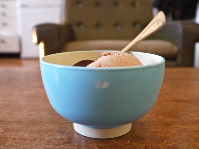 The unfrozen mixture is like the best peanut butter smoothie of your life in the whole world, so with that in mind I’m not quite sure on the quantities this makes, but I’d say just under a litre, which I wouldn’t want to feed any more than four people with. As I said, the method is winningly uncomplicated, so it wouldn’t be too taxing to double all quantities. The salt is important – it really helps intensify the flavour and make everything taste more of itself. Don’t worry about stirring this as it freezes – the useful fat content keeps the texture hovering round the ‘perfection’ level even when completely untampered with. The ice cream itself is pale but the chocolate presence is definite, shot through with the cream’s light butteriness. Being ice cold softens any of peanut butter’s rougher flavour undertones and hanging out with chocolate brings out its earthy sweetness. It’s wackily delicious stuff.