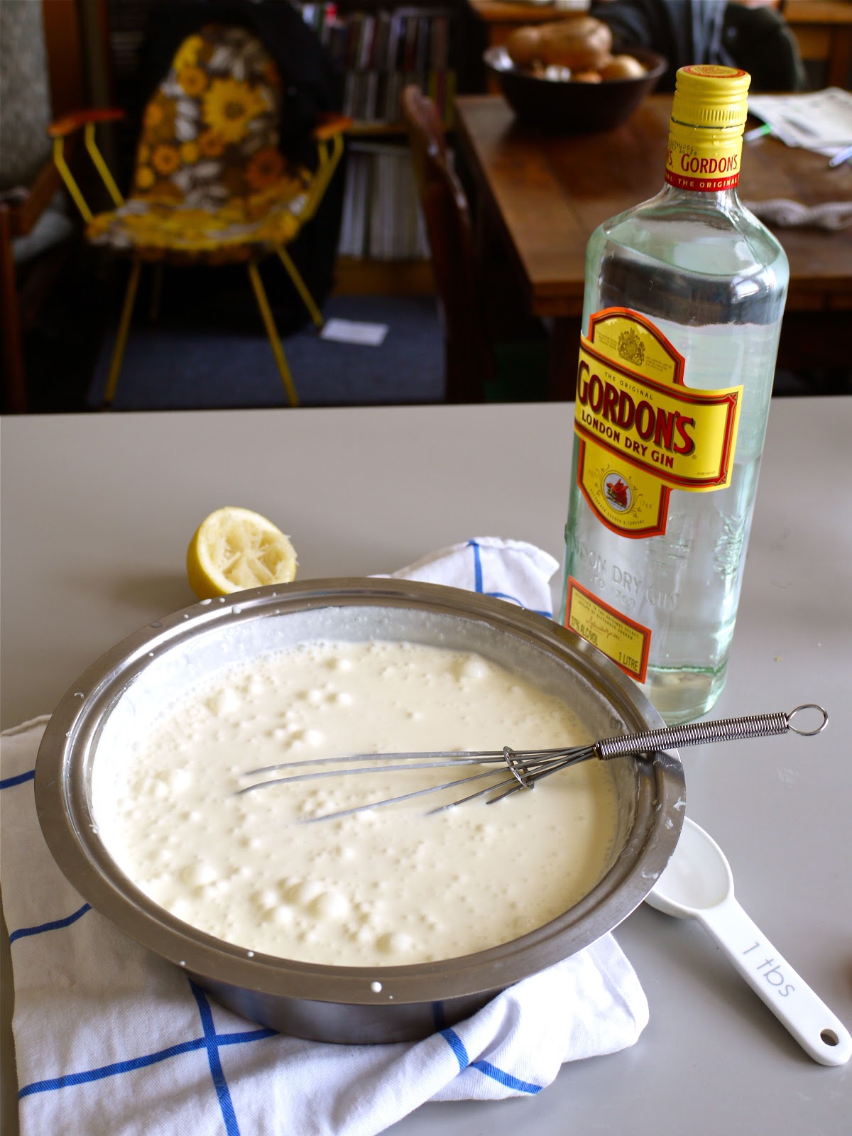 Tip the sugar into a bowl and add the lemon juice, gin, and tonic water. Stir to dissolve a little, then pour in the cream. Whisk till thickened. You’re not looking for whipped cream here, just something that has the texture of, say, a good thickshake. Transfer to a freezer-proof container (like – haha! – an old actual ice cream container) and allow to freeze, of course.
