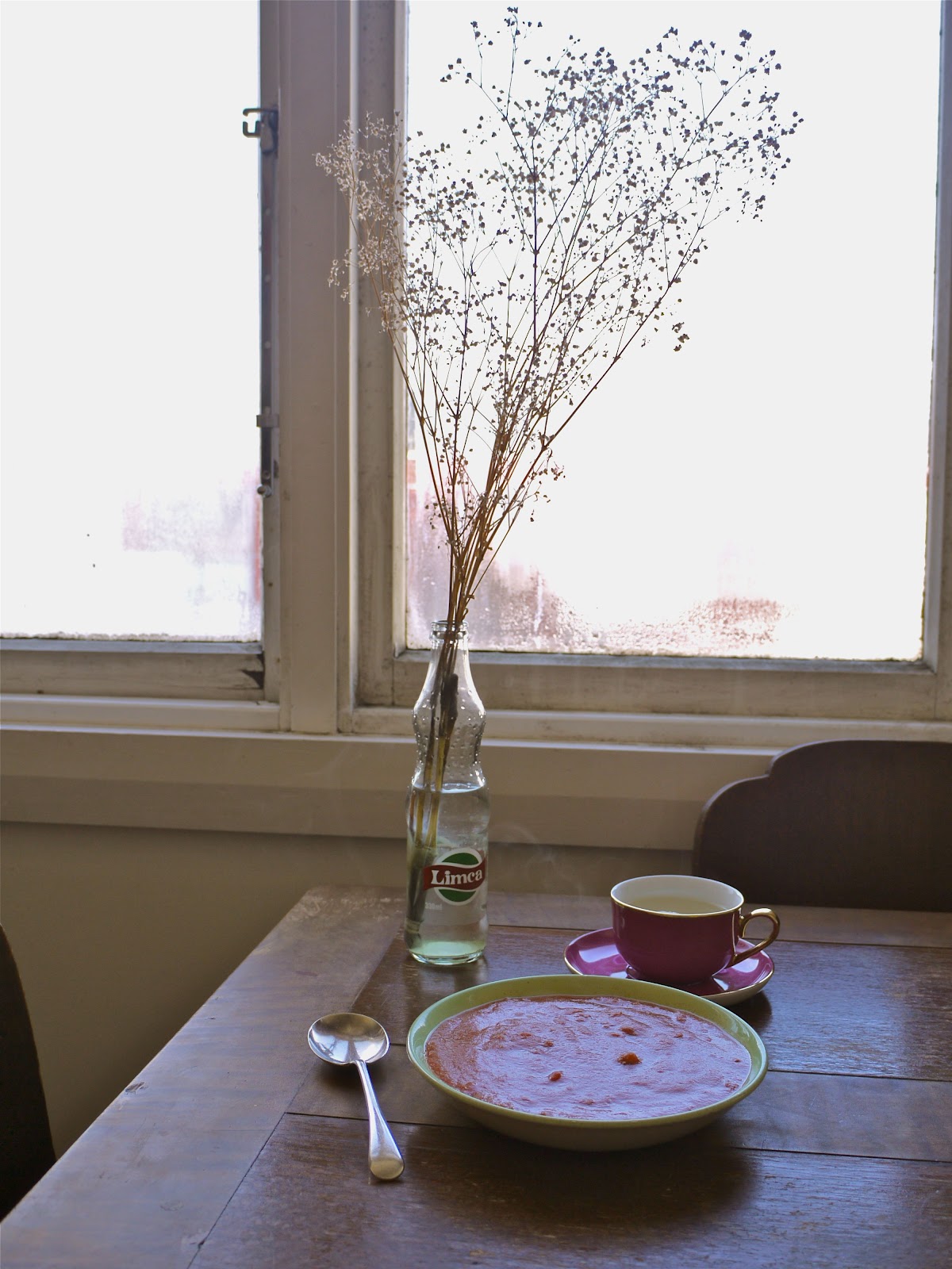 Tomato soup is what it is – you either like it or don’t. This is special yet nothing special at the same time, making it a rather perfect lunch. There’s something inimitable about sake’s clean yet buttery taste and the way it mingles with the slow-simmered tomatoes. The semolina swells and thickens the soup superbly, and the chilli and cinnamon add necessary, fragrant warmth, generally distracting you entirely from the metallic beginnings of these tomatoes. If you don’t have sake kicking around, use sherry, and if you don’t have that kicking around, this will still be really nice, so fear not. And if you don’t have semolina you could use polenta, or just have your soup a little more watery. However, there is also something to be said for following my recipe as it is, too.