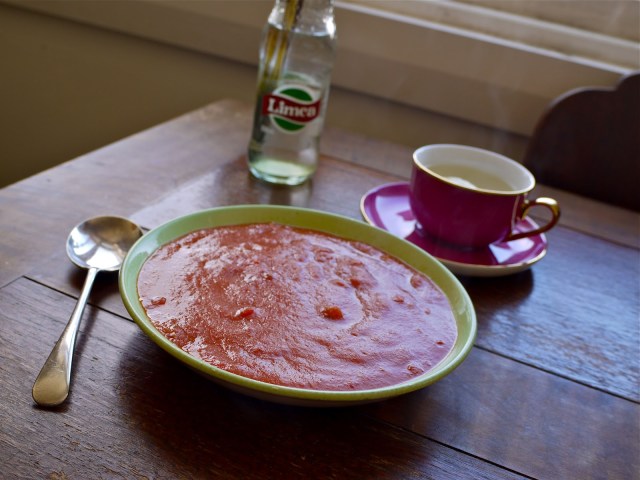 Open the can of tomatoes and tip it into a pan. Fill up the can with water and tip that into the pan too. Add the sambal oelek or chilli, bring to the boil then simmer for about ten minutes, stirring occasionally. If you’re using whole canned tomatoes, mash them up with your wooden spoon as you go. Sprinkle over the semolina, stir it in quickly, and simmer for another five minutes till the soup is thickened. Finally, stir in the sake and a dusting of cinnamon (not even a quarter of a teaspoon – just shake some into your hand and scatter it in from there) plus salt to taste, and serve.
