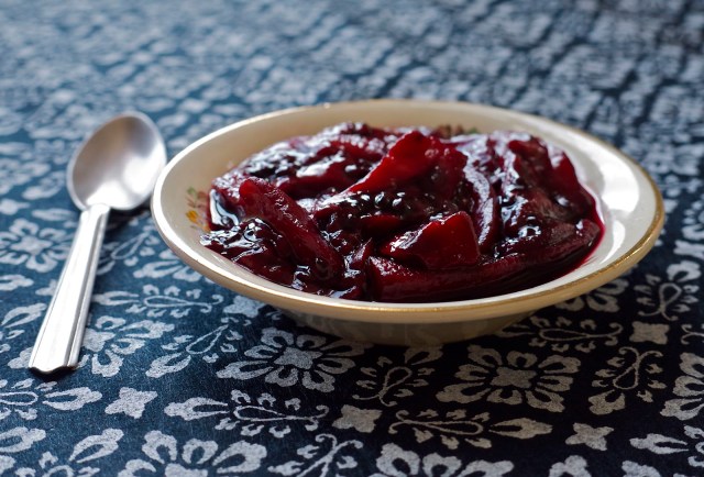 Slice the tops off the tamarillos and using a sharp knife, slice off the skin. Then slice the newly naked tamarillos lengthwise, or however you please, really. Place them in a bowl. Pour over the syrup and the wine, spear with the cinnamon stick and the cloves, and grind over plenty of salt. Cover with plastic wrap and refrigerate overnight. I don’t have a dehydrator, but the recipe recommends putting them in it if you do.