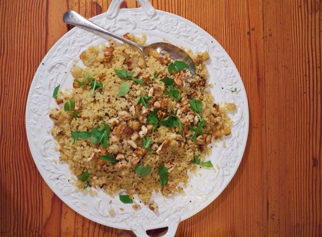 Remorse hit as soon as I started heaping this upon the large white dish. Like, it’s not even a plate, I think it’s more for putting cakes on. Who do I think I am. Some kind of…food blogger? Well, okay. But tiny grains and a flat surface are not practical for extracting spoonfuls of. It looked dramatic and pretty though, and what price that? Anyway, stepping back a little, what you are looking at here is golden, fried tiny cubes of potato, stirred into soft, spiced burghal wheat, jeweled with walnuts and nigella seeds and rocket. Carbohydrates, be they bread or pasta or rice or noodles or couscous, or, in this case, wheat and potatoes, have this “everything’s gonna be alright” filling warmth to them, and so it goes that carb-on-carb is doubly comforting. Potato pizza. Marmite and crisps sandwiches. Spaghetti on toast. Dipping hot chips into potato and gravy. And this. Which I thought up myself, although I’m sure I must have seen it somewhere before – I’m good, but not that good.