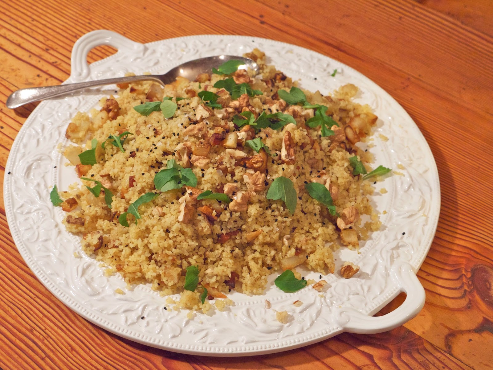 Once the potatoes are good and crisp, lift the dinner plate off the bowl to reveal fluffy, enfluffened, fluffed up (yes) burghal. Remove the potatoes from the heat, tip in the burghal, stir it all around, tip that into a serving bowl, and sprinkle over the rocket leaves, the walnuts, and the nigella seeds.