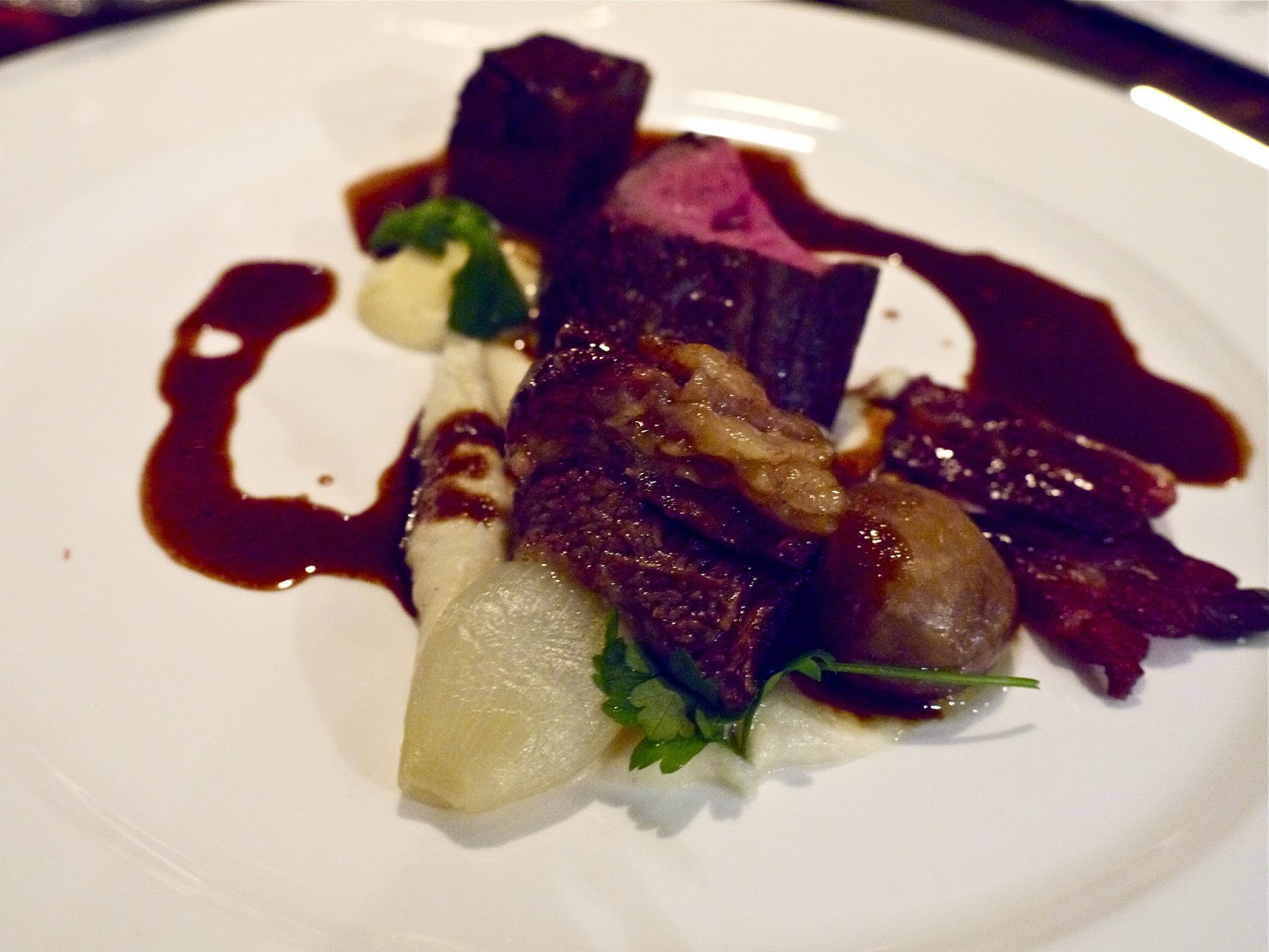 The best bits: I attended this same dinner last year and while it was amazing, this year’s menu felt like it had stepped up even more. The first course was wonderful – the lightest, cleanest salmon, both slivered and cubed to maximise on its excellent texture. Attention to texture was a huge part of the evening – crunchy buttery pastry around soft, shredded pork with a tender scallop; meltingly fibrous steak with gelatinous, soft beef shin; firmly seared fish with cloud-like mash and floaty foam. Everything was just wondrously good. I know hardly anything about wine, but I do trust my tastebuds enough to confidently say that everything I drank was exquisite (and got more and more so as the night went on, funny that.) The fun thing about tasting wine in this manner – or in fact any situation where you’re tasting a range of something – is going with your instincts and working out exactly what it is you are tasting and what you prefer and so on and so forth. And you’re drinking wine, so that’s fun. I loved the two that were served with the third course – a 2008 Seresin Marama Sauvignon Blanc from the Wairau Valley, and a 2010 Henri Bourgeois Sancerre Cuvee d’Antan, from the Loire Valley. Both had a distinct touch of passionfruit about them, but the French was sweeter, while the New Zealand one was a little spicier and muskier. Both were brilliant with the course itself, especially working with the sweet mildness of the scampi and the mustard creaminess of the wasabi mash. Meanwhile, the wine I drank with the fourth course (2008 Ata Rangi McCrone Vineyard Pinot Noir from Martinborough, and a 2007 Bertrand Maume Gevrey Chambertin from Burgundy) was more savoury, clean, a little spicy and quite richly liquor-y on the French side, with the New Zealand wine giving hints of fruitcake and berries. Fun! I got to sit at the table with Lindsay and Poizat, both charming, and it was very enjoyable hearing their insider knowledge (hot tip: wine is delicious) up close and personal.