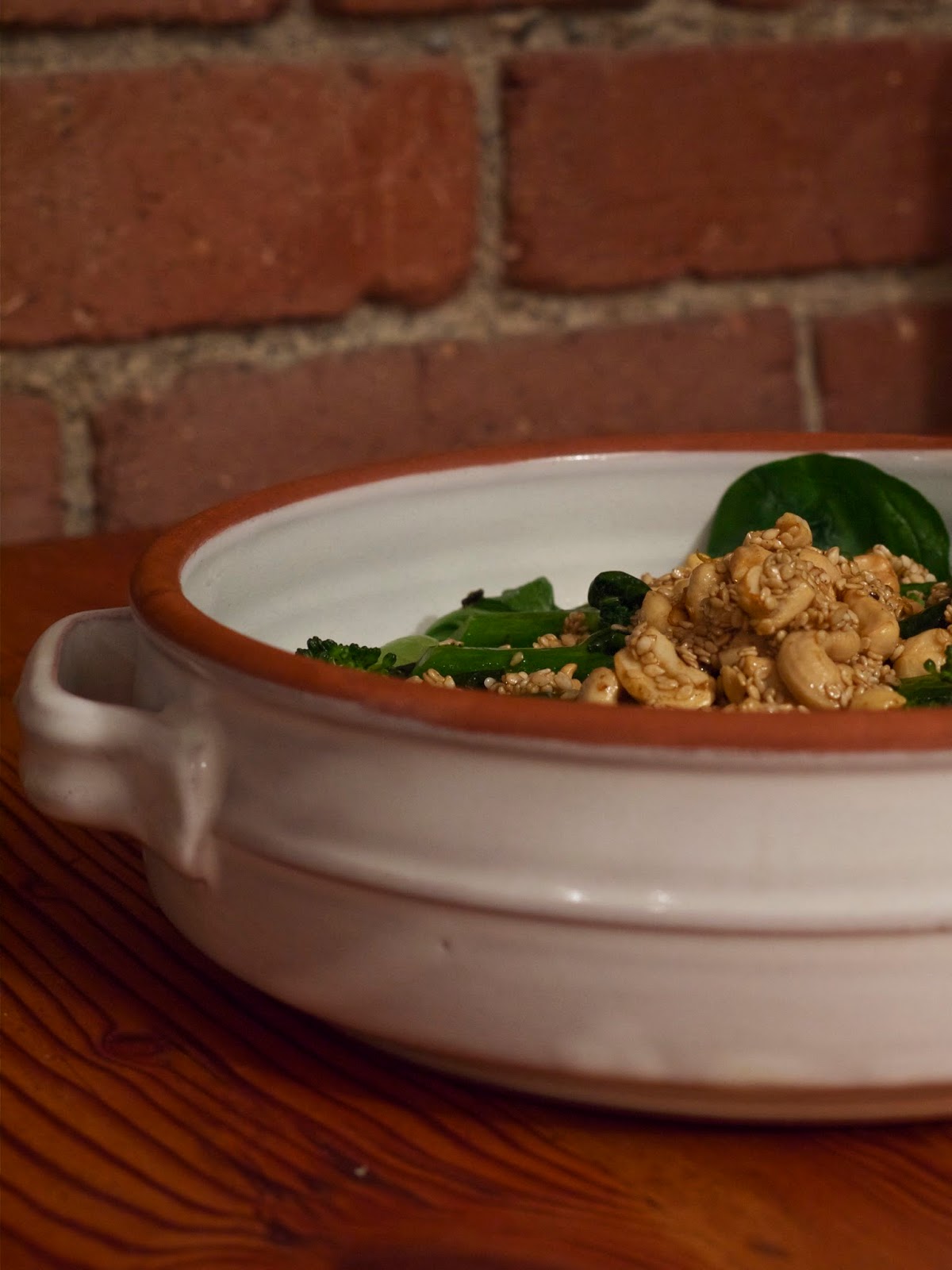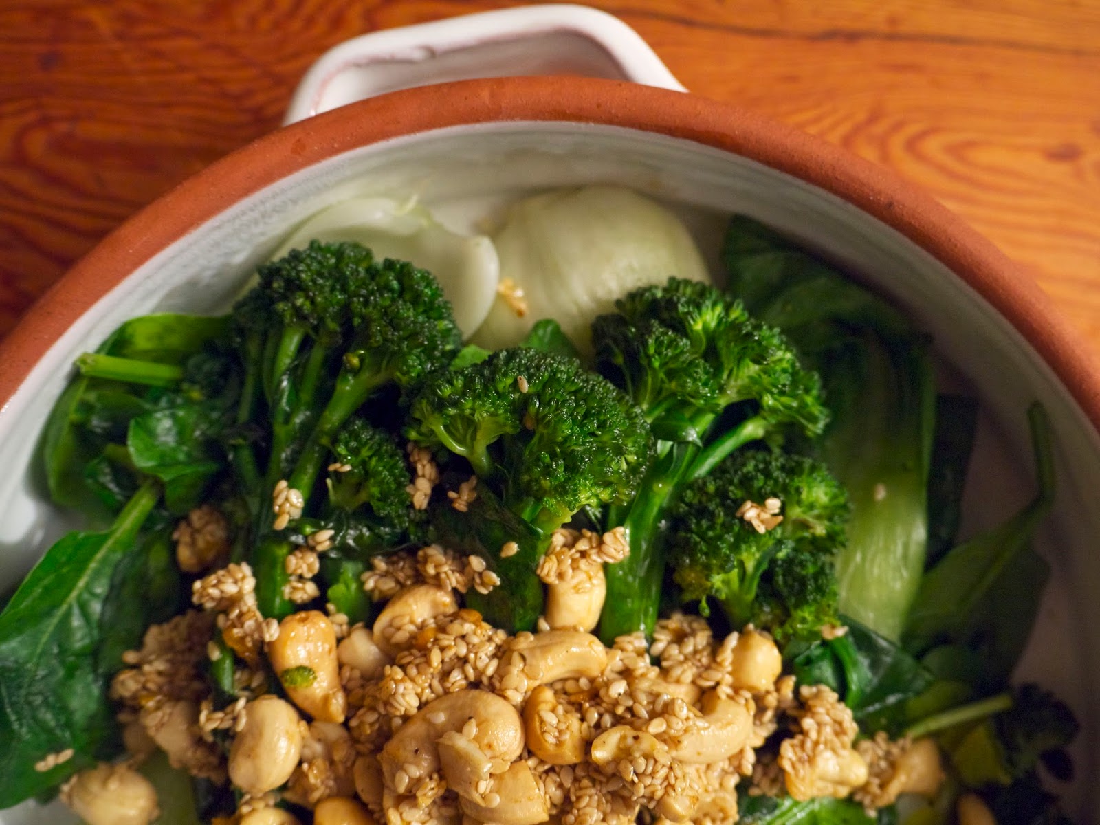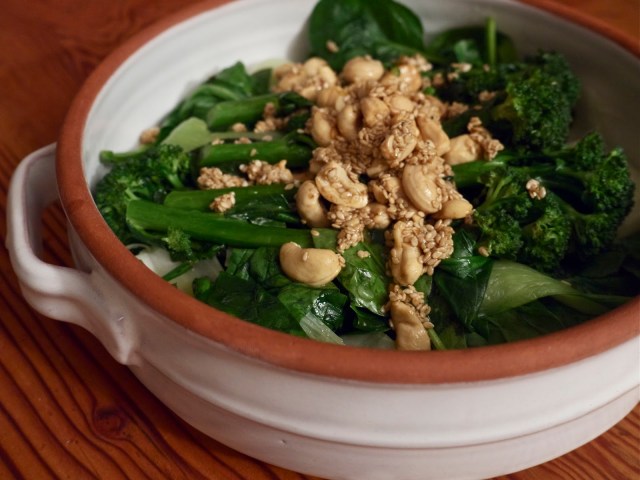 Wash the broccoli and bok choi leaves. Heat up a teaspoon of the sesame oil in a large pan, then throw in the broccoli and bok choi and stir around for a little bit to coat in the oil, then tip in 1/4 cup water and put a lid on the pan, so the water can bubble up and quickly steam everything. Once the water is evaporated, or thereabouts, and the vegetables have softened a little but are still bright green, remove the lid and stir in the spinach. Then remove all of that to a serving dish. Finally, melt the butter in the same pan, stir in the kecap manis, juice and zest of the lime, sesame seeds and cashew nuts. Allow to bubble away until the sesame seeds have browned slightly, then remove from the heat and tip onto the vegetables. Either stir through or take it to the dining table and make everyone wait while you photograph it, because you’re a highly strung food blogger.