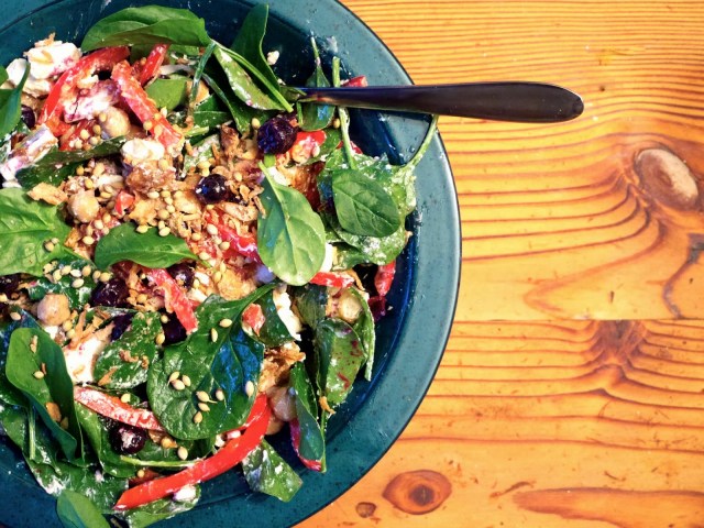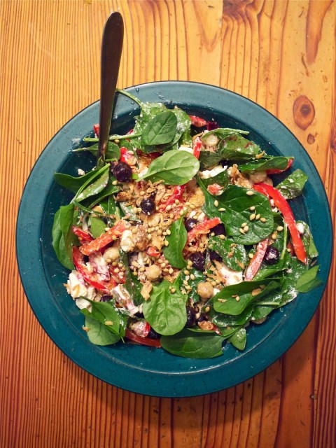I then stirred about 1/2 a cup of the berries into a salad along with 1 drained can of chickpeas, a few handfuls of handful of baby spinach leaves, one finely sliced and overpriced capsicum, an entire damn packet of feta, roughly crumbled, plus some more olive oil and coriander seeds and a generous spoonful of fried shallots from a packet. It was a wondrous combination – crispness and crunch of the juicy, fresh kind and the fried, brittle kind; the sweet blueberries against the creamy salty feta and the bite of chili against everything, really.