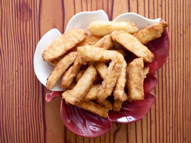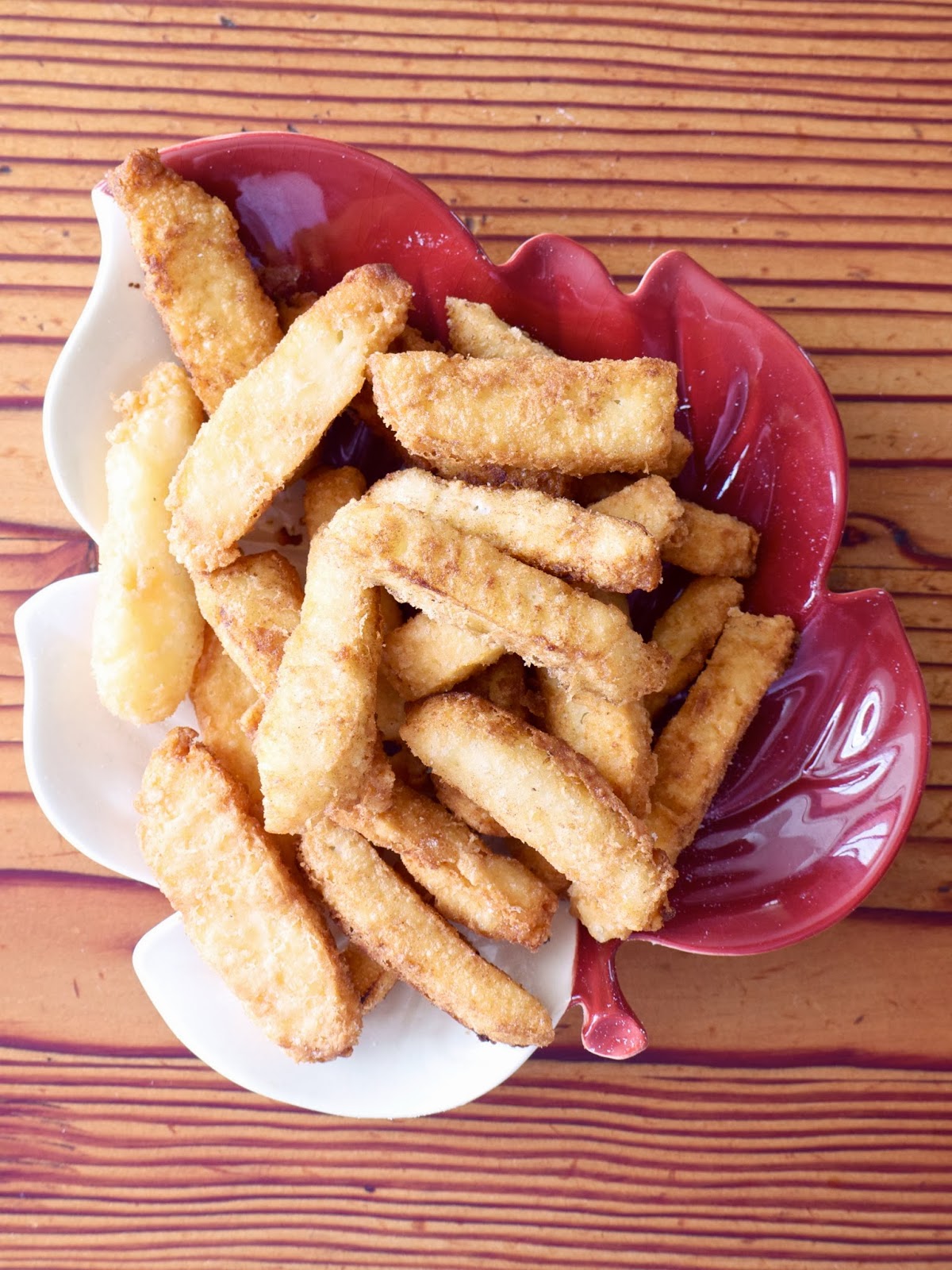 Slice the halloumi into relatively even rectangles. I can’t tell whether I like these better as slightly wider, flatter shapes or thinner, more french-fry esque, so tend to do a bit of both. Any bits that crumble or fall off can still be used as a mid-frying snack for yourself.