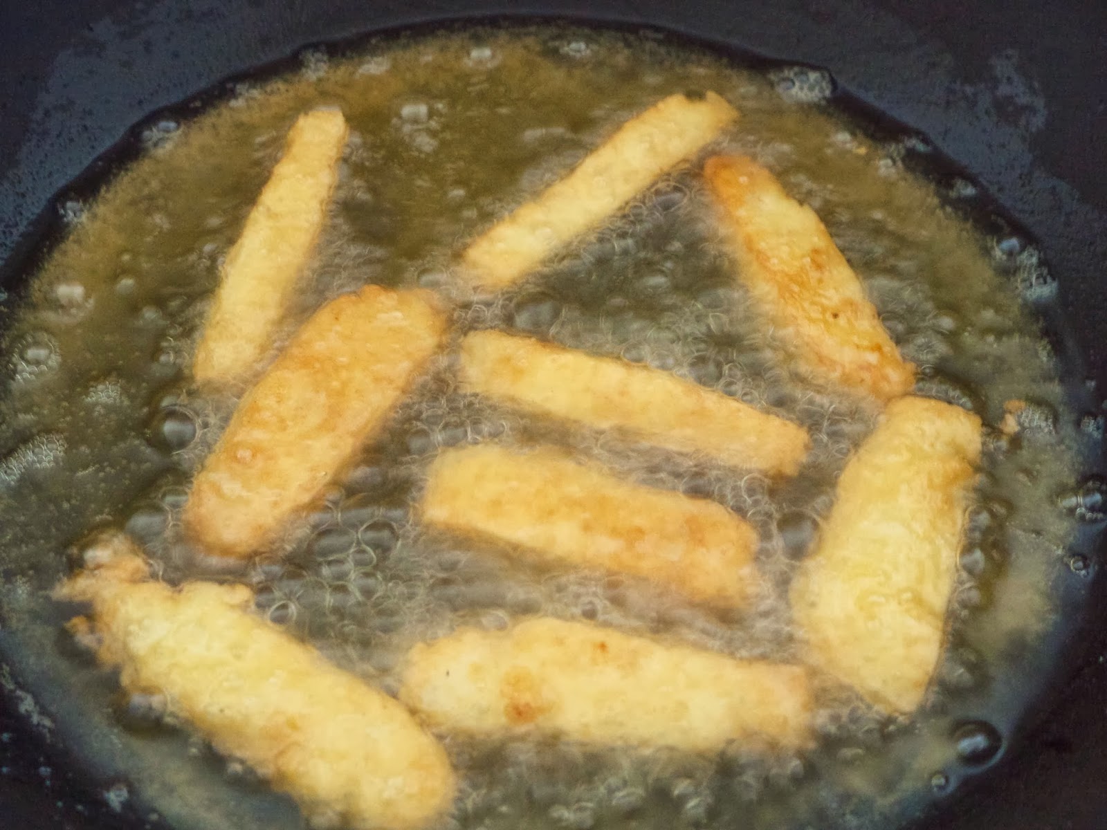 Heat up around an inch and a half of oil in a saucepan – really, that’s all you need – using a little offcut of halloumi to work out when it’s ready to go – put it in the pan and there should be rapid bubbles moving around it. Then eat it, of course.