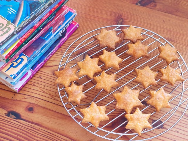 In an entirely more delightful form of scary, Tim and I had a Hallowe’en party at our house on Saturday night. (I feel compelled to tell you that those are his old Goosebumps books in the above picture, not mine: strictly serialised fiction about Teen Girls Making Their Way In The World for me, thank you. I only read Goosebumps when I was at the reading-the-side-of-the-cereal-box stage of being desperate to consume words. Yep, glad we got that straight.) There was an excellent amount of candy, there was popcorn, and there were other foods that fell into the crispy/salty/crunchy/alcohol absorbing venn diagram, like chips and pretzels and these cheese stars that I made.