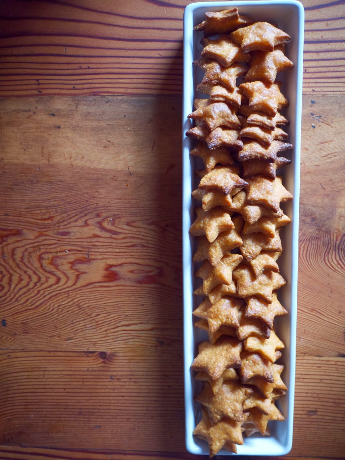 Roll it out to a couple of millimeters thick – I find it useful to do this with half the dough at a time – and cut into stars or however you like. The dough will get more and more easy to roll the more you do it, and can be re-rolled plenty. Bake the stars for around ten minutes. Carefully transfer to a rack of some kind – they’ll get crisper as they cool.