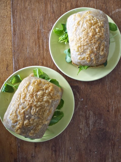 Heat up a large frying pan. Cut four thick slices from the block of halloumi, and split the ciabatta buns in half. Fry the hash browns for about five minutes on each side, till golden and crisp and y’know, blatantly not frozen. Set them aside on a plate and fry the halloumi slices. If you have space in the pan, add the ciabatta bun slices cut side down to warm/toast them slightly, but it’s not essential. Once the halloumi slices are deep golden on both sides, turn the heat off and, if you like, return the hash browns to the pan to let them stay warm in the residual heat.