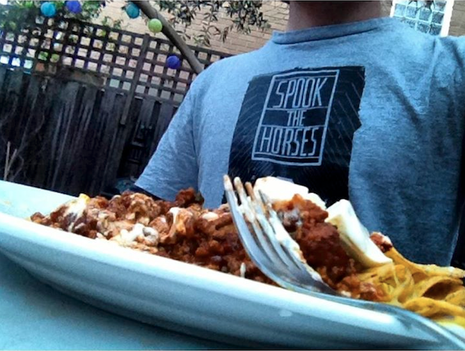 Callum: Nachos! Alex and I used to live together and made developed the Spook the Horses classic, Nachos de los Muertos, which is probably terrible Spanish and probably also very culturally insensitive (Sorry.) It’s a chili delivery mechanism above all else. We all love spicy food so the more different kinds of chili the better. Chipotles and green jalapenos are mandatory. Black beans are mandatory. Watties beans are strictly forbidden. What’s not to love about a cauldron of vicious as hell chili?