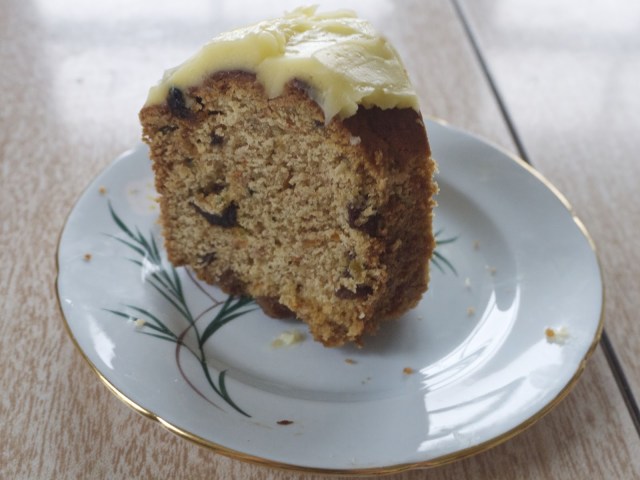And it turned out splendidly! The mixture contains a resolutely old-timey mixture of prunes, grated carrot, grated apple, and sultanas, as if it’s trying to be five different cakes at once, but you get a kind of moist fruitiness that’s very comforting, the sort of cake you want to have with a large pot of tea while the rain dashes at the windows (a very easy scenario to come by in Wellington these days as we approach the middle of a neverending winter.) Honestly, when (when! Not if!) I make this again I’ll increase the apple and carrot quantity to two, and dice the prunes a lot finer – the former sort of dissolved into the cake while the latter were all like “here I am! Prune! In your face!” I’d also use brown sugar instead of white, just to hold all that fruit together with a slightly more darker caramelliness. But honestly, this cake was wonderful, especially when I spread it with a thick cream cheese icing.