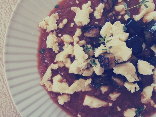 Finally! Add the eggplant flesh to the pan (the burnt stuff, not the fried stuff) and either puree it with a hand-held stick blender thingy, if you have one, or do the stressful thing and transfer it perilously to a food processor and blitz thoroughly. I did the latter, and it doesn’t make it entirely velvety but any texture is pleasing, so, whatever. It’s just so much more of a pain to clean and also it might fly everywhere and you might spill it while getting it in and out of the processor bowl, but anyway. You now have your soup. Ladle into bowls, top generously with the fried eggplant cubes and crumble over plenty of feta.