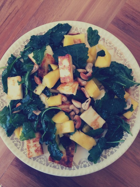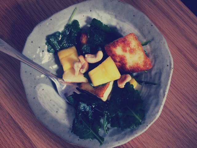 Slice the mango into roughly even smallish pieces, and mix together with the cashews, the paneer, and the kale leaves. Drizzle over more olive oil and sprinkle over a decent amount of salt, stir gently and there you have it: a salad.