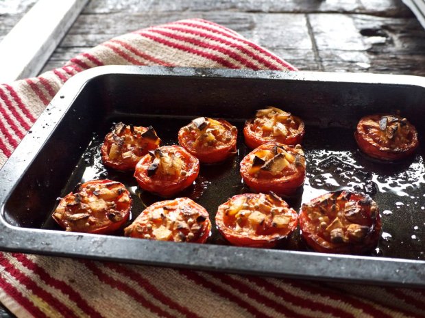 Roast them at that low heat for 20 minutes, and then turn up the temperature to 220 C and continue to roast until the tomatoes are slightly scorched.
