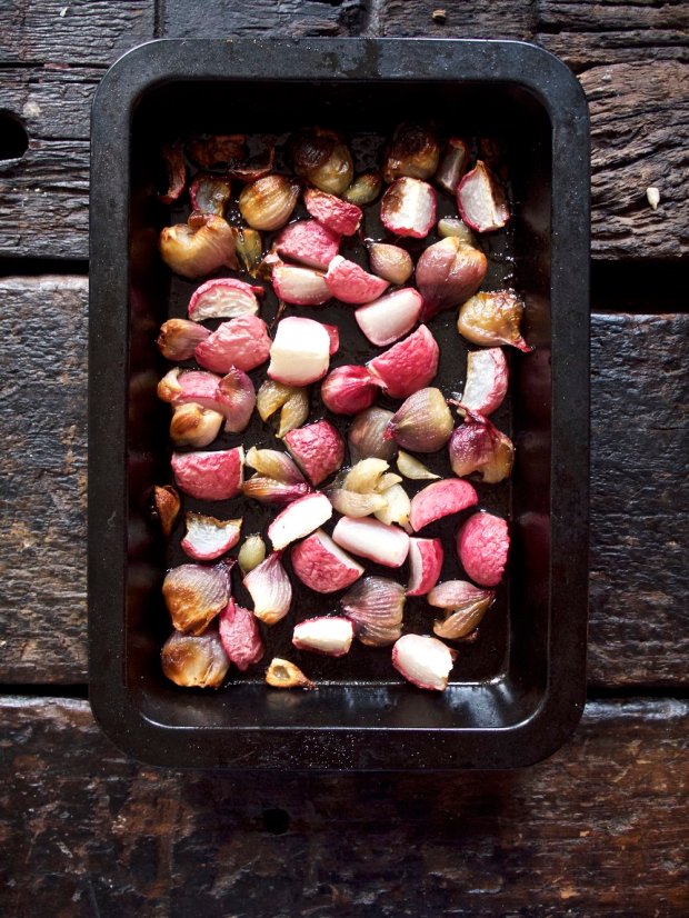 Peel the shallots, which is fiddly and annoying I grant you, but if you press down on them with the flat side of a large knife the skins should split making it easier to slide them out. Chop the radishes into wedges. Place them all in a roasting dish in which they fit snugly. Drizzle over plenty of olive oil, the maple syrup, the bourbon, and a good sized pinch of salt. Give it a stir if you like or just hope for the best.