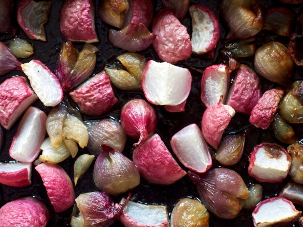 Luckily a more reliable voice said the words “maple bourbon roasted shallots” and suddenly I was inspired anew. This idea expanded out to include radishes (plus some beetroot that I bought for good measure for a later time) and with a bag full of pink-tinged vegetables, I left the market unflustered and happy.