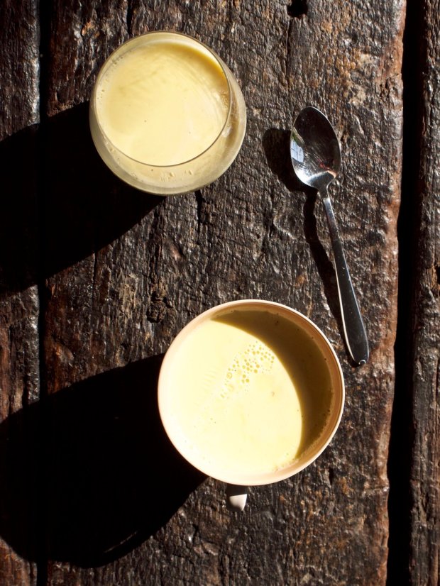 So let’s get to the less uncomfortable content! Panna cotta is an Italian dessert, comprised more or less of cream heated and set with gelatine – silky, yielding yet firm, immensely ploughable to the spoon, rich yet light, rather fancy yet childishly reminiscent of packet-born pudding. I had this idea that turmeric – as in the whole turmeric root, not the vivid yellow powdered stuff – would go well with vanilla – as in the excoriated black dust from an entire bean, not the essence in a bottle. I was pleasingly correct. It’s all very simple – just heat the vanilla and turmeric with the cream and throw in some sugar and gelatine – but has glorious results. The turmeric tints the cream a pale primrose colour and gives it a slight lemony-carroty freshness (I don’t know if that sounds awful but I promise you it’s good) and the vanilla seeds have a soft, almost chocolatey richness which makes it taste incredibly luxuriant and scented-candle-y. If you can’t get hold of whole turmeric root I imagine a small teaspoon of powdered stuff would work okay but it might be a bit intense and earthy – maybe change tack completely and instead use the grated zest of a lemon or grapefruit.