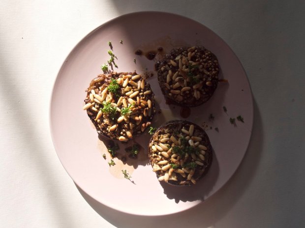 field mushrooms stuffed with tahini, garlic, pine nuts and coriander seeds