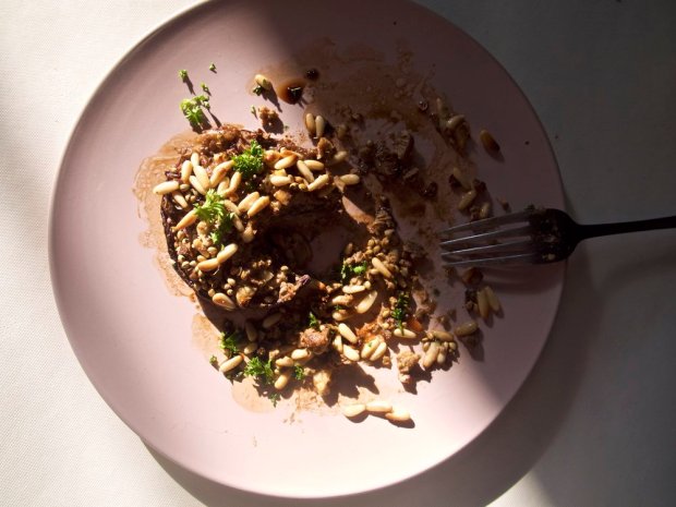 Mix the tahini with two tablespoons of water to make a paste, then spread this thickly over the top of the mushrooms (as in, the spore-y cavity, the underside of the top, the bit where you’d expect to stuff a mushroom, idk, just look at the pictures) and divide the mushroom stem-garlic mixture between the three of them. Sprinkle over the coriander seeds and pine nuts and press everything into the tahini so it kind of glues it into place.
